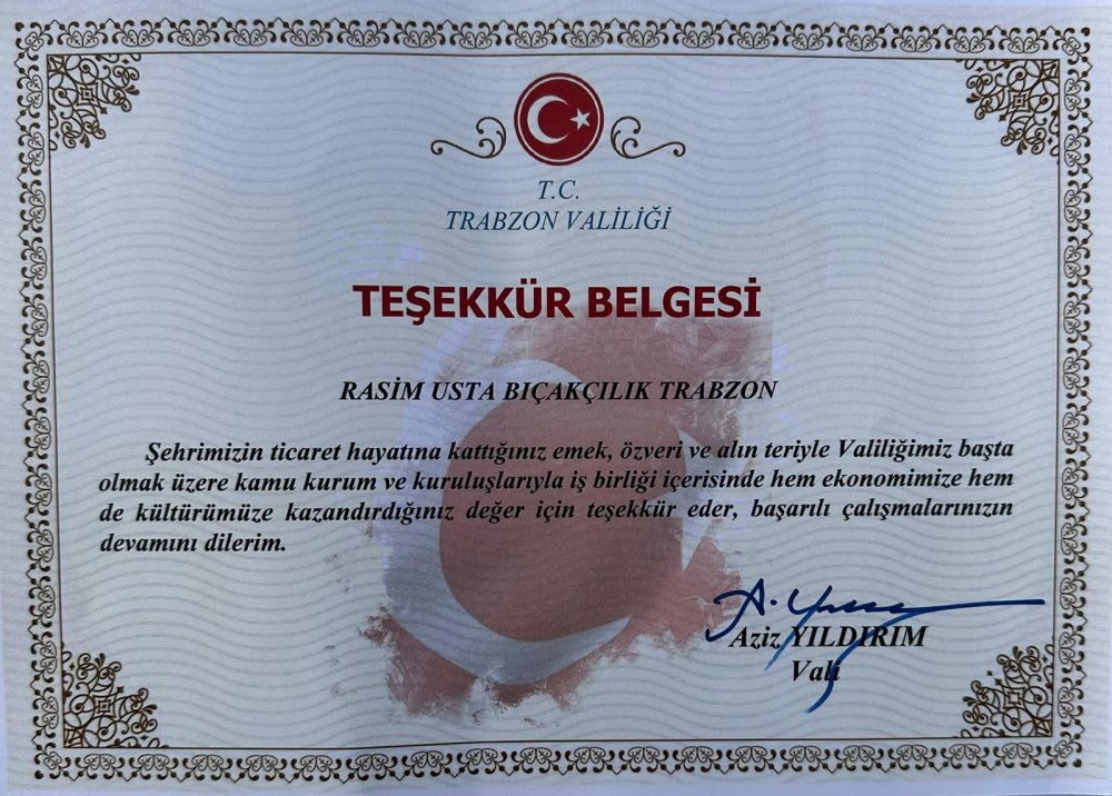 Bıçak ve kılıç ustası Rasim Özyiğit teşekkür belgesinden dolayı İçişleri Bakanlığı Personel Genel Müdürlüğüne atanan ve önceki dönem Trabzon Valisi olan Aziz Yıldırım'a çok teşekkür ederek,ne kadar minnettar olduğunu ifade etmekte zorlandığını dile getirdi.