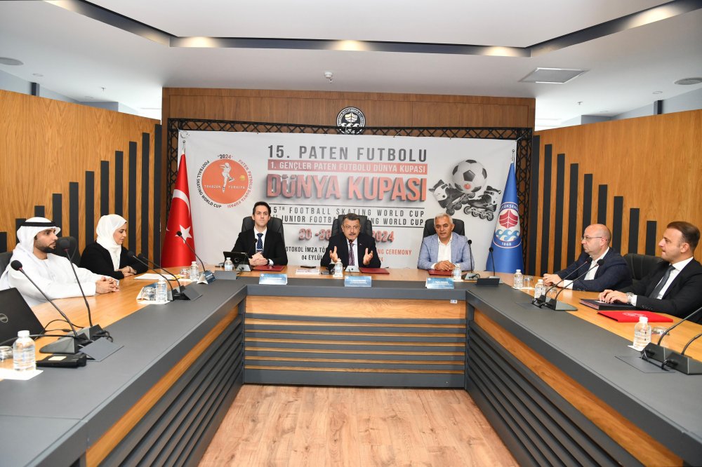 Trabzon Büyükşehir Belediyesi’nin ev sahipliğinde; Trabzon Valiliği, Dünya Paten Futbolu Federasyonu ile Gençlik ve Spor İl Müdürlüğü iş birliğiyle uluslararası bir organizasyona imza atılıyor. 20-26 Kasım tarihleri arasında Türkiye’de ilk kez Trabzon’da düzenlenecek 15. Paten Futbolu Dünya Kupası için Büyükşehir Belediyesi’nde ‘Protokol İmza Töreni’ gerçekleştirildi. Büyükşehir Belediye Başkanı Ahmet Metin Genç başkanlığında düzenlenen toplantıya Dünya Paten Futbolu Federasyonu Başkanı Mehdi Salman Pour, Arap Devletleri Paten Futbolu Federasyonu Yönetim Kurulu Üyesi Nasser Hamed Al Mukhaini, Asya Paten Futbolu Federasyonu Başkanı Khulood Salim Al Junaibi, Paten Futbolu Türkiye Temsilcisi Sayim Adanur ve Büyükşehir Belediyesi Gençlik ve Spor Hizmetleri Dairesi Başkanı Özgür Kara katıldı.