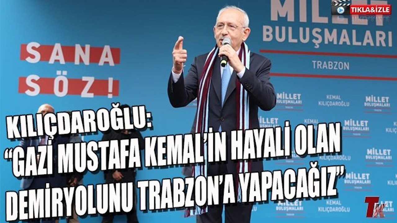 Cumhurbaşkanı adayı Kemal Kılıçdaroğlu Bu ülkenin birleşmeye ihtiyacı var. Bu ülkenin huzura ihtiyacı var. Bu ülkenin beraber olmaya ihtiyacı var. Bu ülkenin kucaklaşmaya ihtiyacı var dedi. Kemal Kılıçdaroğlu emeklilere verilen bayram ikramiyeleri hakkında ise “8500 lira eksik verdiler. 15 bin lira hesaplarınıza yatacak göreceksiniz bunu. Bay Kemal o paraların tamamını bulacak söz veriyorum” dedi. Kılıçdaroğlu Gazi Mustafa Kemal’in bir hayali var. Demiryolu hayali var. 100 yıl önce söyledi. Allah nasip ederse Atatürk’ün o hayalini gerçekleştireceğiz dedi. Kılıçdaroğlu “Trabzon’da Hafif Raylı Sistem konusunda sorunlar var. 10 Trabzonlu var. 4’ü bakan. Büyükşehir Belediye Başkanı. 10 Trabzonlu bir hafif raylı sistemi yapamıyor. Bir Trabzonlu hiçbir dünyada olmayan 10 metre inşaatını birden yapıyor. Gerçekler böyle. Çalışıyor yapıyor. Üstelik bütün engellemelere rağmen yapıyor” dedi.