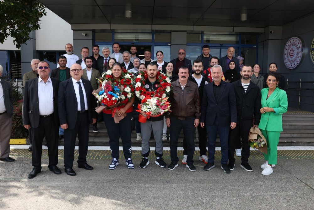Altın madalyanın sahibi olan Havvanur Kethüda ve Milli Takım Antrenörü Muhammet Çat Trabzon Havalimanında çiçeklerle karşılandı.